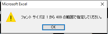 フォントサイズのボックスに500と入力すると「フォントサイズは1から409の範囲で指定してください。」と警告が表示されます。