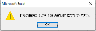 - ちなみに、行高さも制限があります。「セルの高さは0から409範囲で指定してください。」と警告が表示されます。
