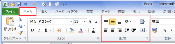 - [ホーム]タブの[配置]グループにある[左揃え]、[中央揃え]、[右揃え]のいずれかを選択します。