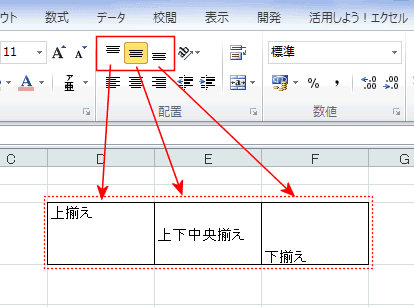 - [ホーム]タブの[配置]グループにある[上揃え]、[上下中央揃え]、[下揃え]のいずれかを選択します。
