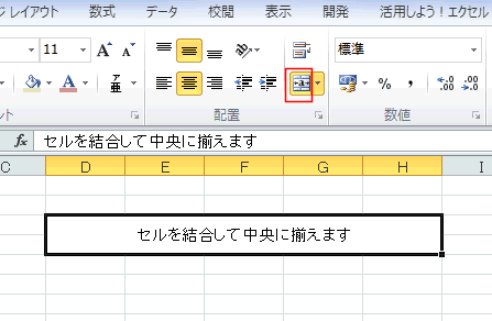 - D3:H4セルを選択して、[セルを結合して中央揃え]を実行します。