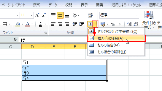 - [セルを結合して中央揃え]ボタンの右の▼をクリックして[横方向に結合]を実行します。