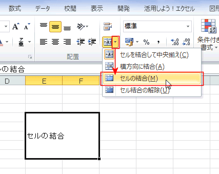 - [セルを結合して中央揃え]ボタンの右の▼をクリックして[セルの結合]を実行します。