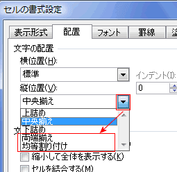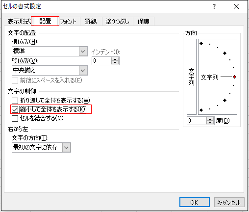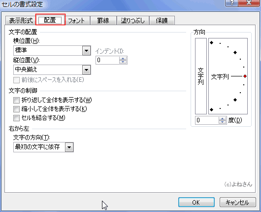 - セルの書式設定ダイアログの[配置]タブが開きます。