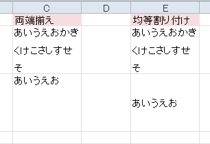 文字数が1行に収まるときに上に揃うのが「両端揃え」、中央に揃うのが「均等割り付け」といった違いがあります。