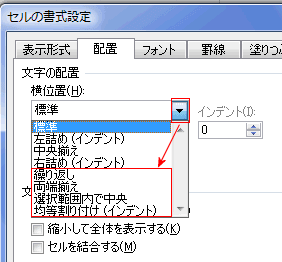 - 横位置に「繰り返し」〜「均等割り付け(インデント)」があります。