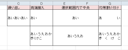 - 繰り返し、両端揃え、選択範囲内で中央、均等割り付け(インデント)