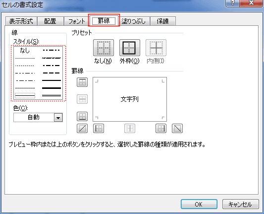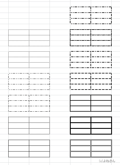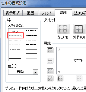 - セルの書式設定の罫線タブでは「なし」の下の細かい点線に見えるスタイルを使います。
