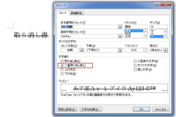 - フォントのダイアログボックスに「二重取り消し線」があります。