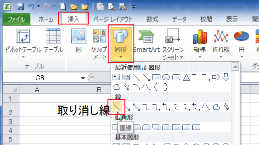 - 挿入タブの[図形]→[直線]で直線を引きます。