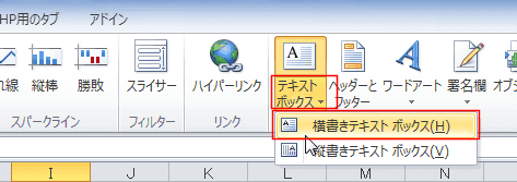 - [挿入]タブの[テキストボックス]→[横書きテキストボックス]を実行して、テキストボックスを作成します。