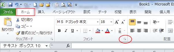 セルを選択して、[ホーム]タブのフォントグループにあるダイアログボックス起動ツールをクリックします。
