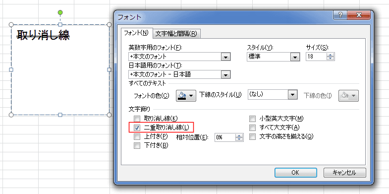 - よって、Excelで2重取り消し線を引くには他の機能を利用することになります。