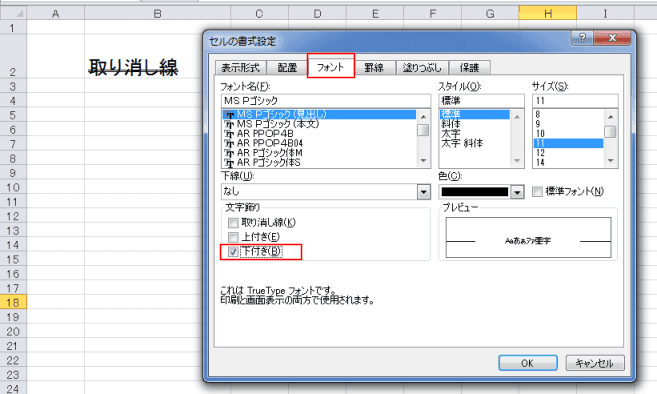 - 文字飾りの「下付き」にチェックを入れます。