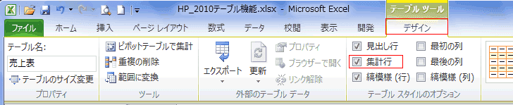 - [デザイン]タブの[テーブルスタイルのオプション]グループで[集計行]にチェックを入れます。