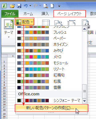 - [ページレイアウト]タブの[テーマ]グループにある[配色]→[新しい配色パターンの作成]を実行します。