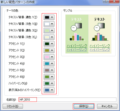 - [新しい配色パターンの作成]ダイアログボックスに表示されている配色を変更します。