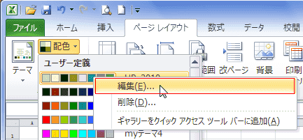 - [配色]のユーザー定義に登録されているテーマの色を右クリックし、[編集]を実行します。