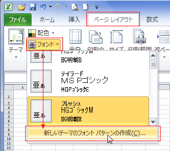 - [ページレイアウト]タブの[テーマ]グループにある[フォント]→[新しいテーマのフォントパターンの作成]を実行します。