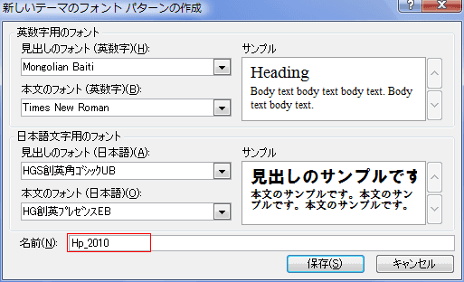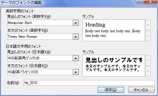 - [新しいテーマのフォントパターンの作成]ダイアログで各フォントを設定し、名前に入力して保存します。