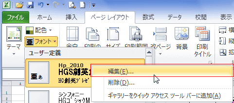 - [フォント]のユーザー定義に登録されているテーマのフォントを右クリックし、[編集]を実行します。