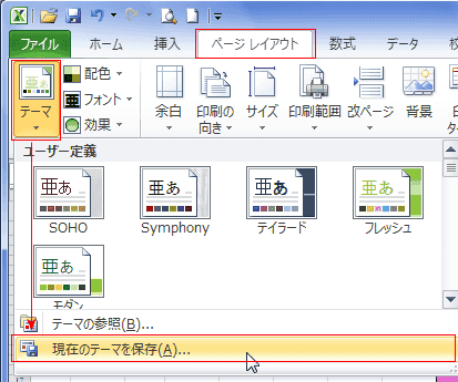 - [ページレイアウト]タブの[テーマ]グループにある[テーマ]→[現在のテーマを保存]を実行します。