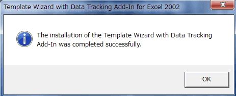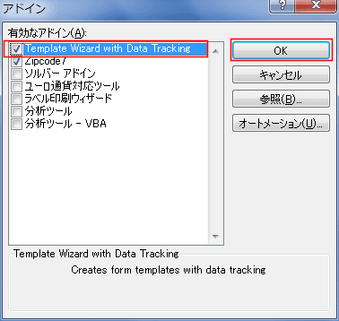 - アドイン画面が表示されましたので、「Template Wizard with Data Tracking」にチェックを入れ[OK]ボタンをクリックしました。