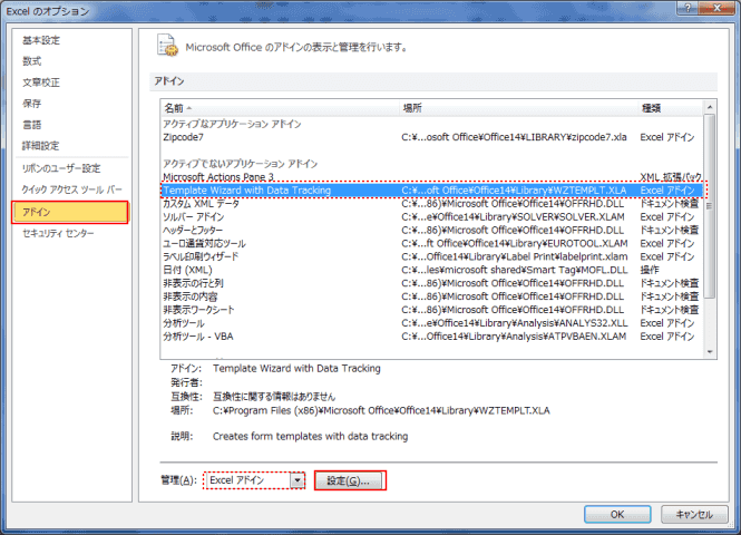 [アドイン]を選択すると、アクティブでないアプリケーション アドインに「Template Wizard with Data Tracking」が見つかりました。