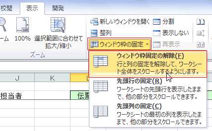- [表示]タブの[ウィンドウ]グループにある[ウィンドウ枠の固定]→[ウィンドウ枠固定の解除]を実行します。