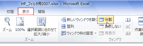 - 分割の解除は、[表示]タブの[ウィンドウ]グループにある[分割]を実行します。