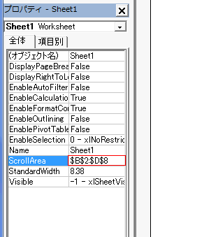 - プロパティ ウィンドウのScroll Areaにセル範囲を設定します。