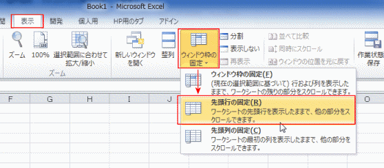 - [表示]タブの[ウィンドウ]グループにある[ウィンドウ枠の固定]→[先頭行の固定]を実行します。