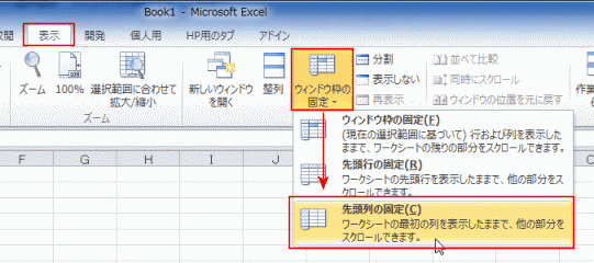 - [表示]タブの[ウィンドウ]グループにある[ウィンドウ枠の固定]→[先頭列の固定]を実行します。