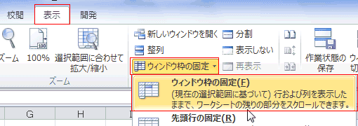 - [表示]タブの[ウィンドウ]グループにある[ウィンドウ枠の固定]→[ウィンドウ枠の固定]を実行します。
