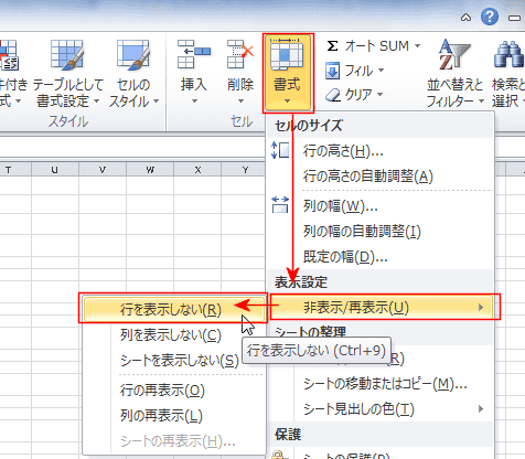 - [ホーム]タブの[書式]→[非表示/再表示]→[行を表示しない]を実行します。
