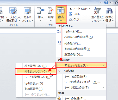 - [ホーム]タブの[書式]→[非表示/再表示]→[列を表示しない]を実行します。