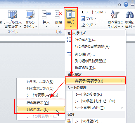 - [ホーム]タブの[書式]→[非表示/再表示]→[行の再表示]または[列の再表示]を実行します。