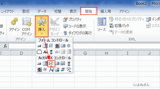 よねさんのExcelとWordの使い方|エクセル2010基本講座:目次|フォーム・ActiveX・マクロ(VBA)|チェックボックス(ActiveXコントロール)をシートに配置する