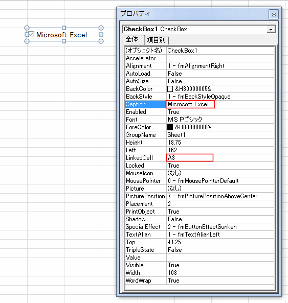 - Captionに「Microsoft Excel」、LinkedCellに「A3」と入力して、設定しました。