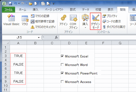 - [コントロール]グループにある[デザインモード]がオンになっているのを確認してください。
