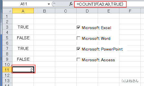 - A11セルに「=COUNTIF(A3:A9,TRUE)」と入力すると「2」となり、カウントされました。