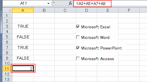 ワークシートではTRUE=1、FALSE=0で足し算ができます。