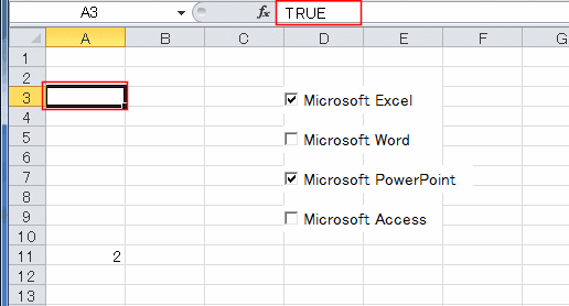 - シートに配置したチェックボックスをクリックすると、チェックボックスがオン/オフ となり、LinkedCellに設定したセルに True/False が表示されます。