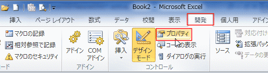 - 開発タブの[コントロール]グループにある[プロパティ]をクリックします。