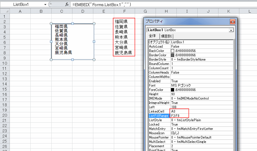 リストボックスを選択して、プロパティでLinkedCell「A3」、ListFillRange「F2:F8」と設定しました。