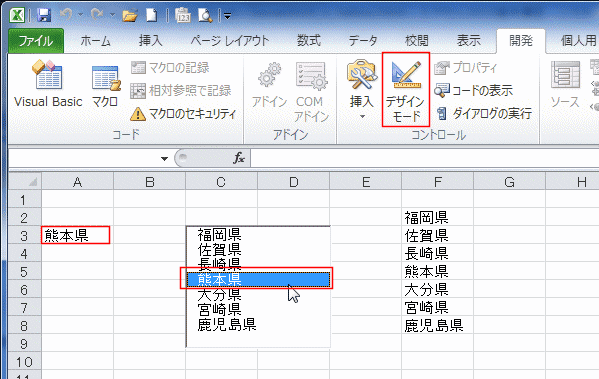 - 開発タブの[デザインモード]をオフにして、リストボックスの動作を見てみます。