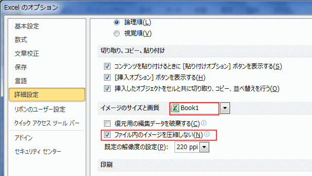 - ファイルタブのオプションを実行し、詳細設定で「ファイル内のイメージを圧縮しない」のチェックをオンにした(チェックを入れた)状態にします。