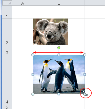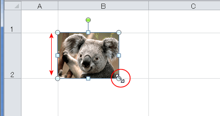 - 写真のサイズをセルに合わせるには、[Alt]キーを押した状態で、右下のハンドルをドラッグしてサイズを変更します。