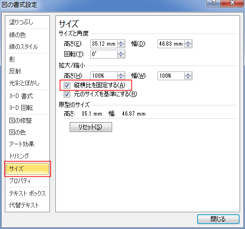 [サイズ]を選択すると、「縦横比を固定する」の設定がありますので、縦横比の保持をするか否かを設定することができます。