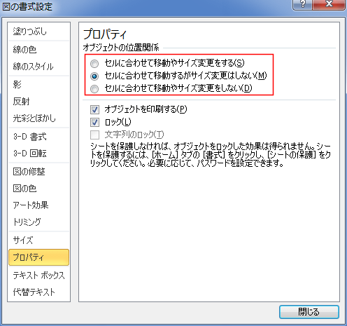 「セルに合わせて移動やサイズ変更する」「セルに合わせて移動するがサイズ変更はしない」「セルに合わせて移動やサイズ変更しない」から選択します。